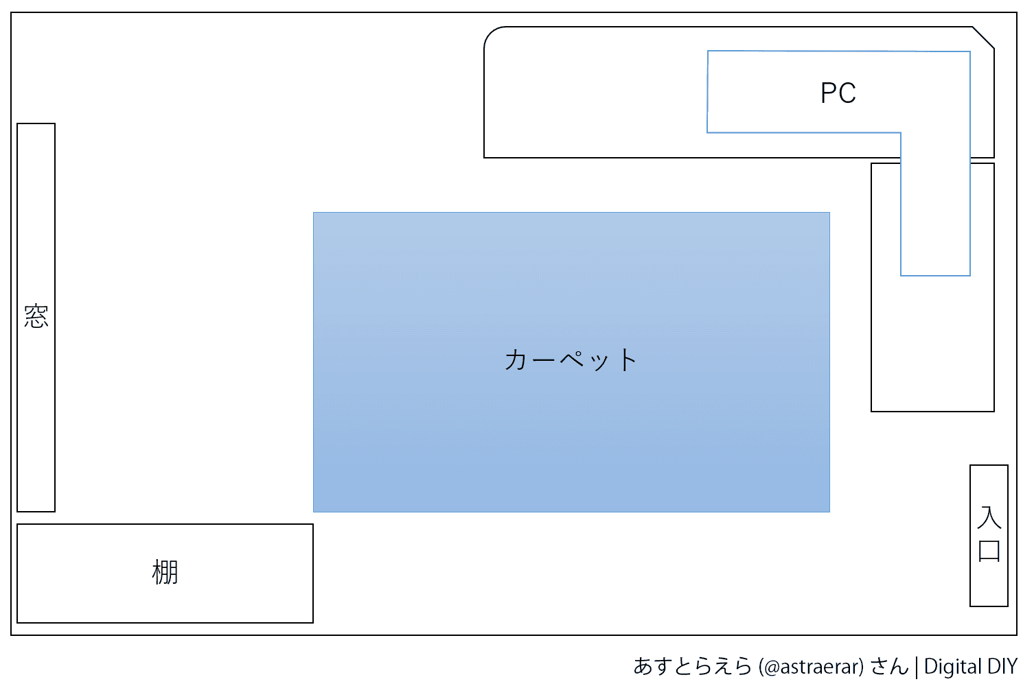 | あすとらえらさんのPC作業部屋の間取り図です。L字デスクの配置で、部屋の中央部分がひろびろと使えますね! |