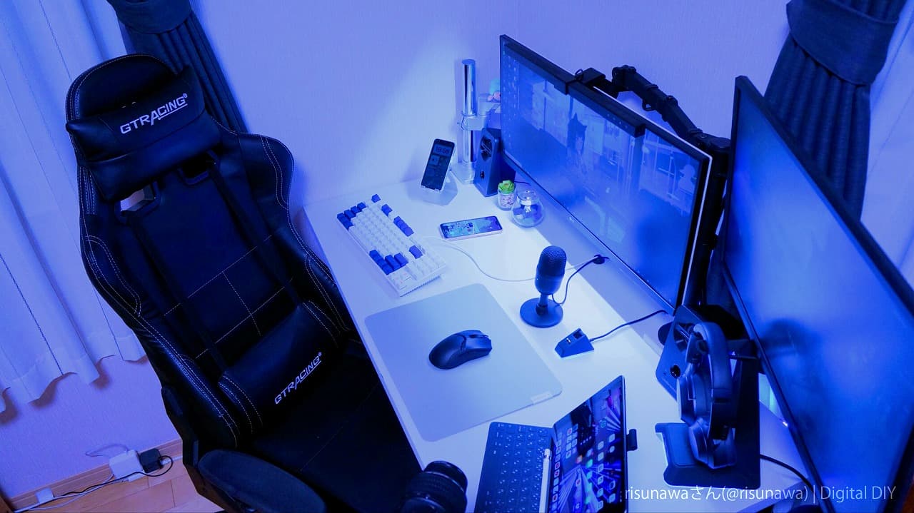 紫がかったブルーのクールな間接光に包まれたrisunawaさんのPCデスク周り。スマートフォンやタブレットなどのデバイスも手元に置かれ、操作がしやすそうです。デスクアームを使うことで、机上の作業スぺースも確保でき、周辺機器も散らかることなく設置できますね!
