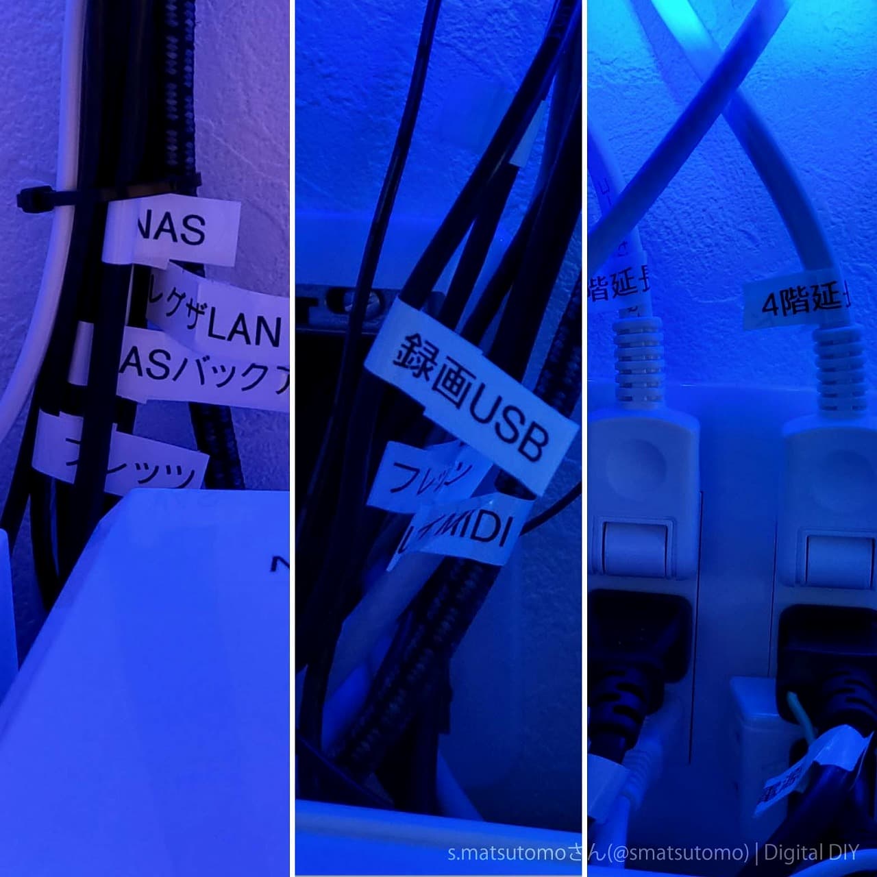 先進ツールと見せかけ、実はやっていることはアナログなんですがコレ絶対に役に立ちます。要は線の元に貼るのですが、書く・切る・貼るが1デバイスで済むのでスイスイ行けます。あと何がどれと繋がってると覚えてるうちはいいのですが、忘れた時が地獄です。接続先は見れば一目瞭然なのですがなんせ辿るのが大変だし、隣の部屋を往復したり、高い所にいちいち脚立使って見に行ったりは大変です。うまく隠して、あとあとのメンテナンスもスマートにいきたいですよね。